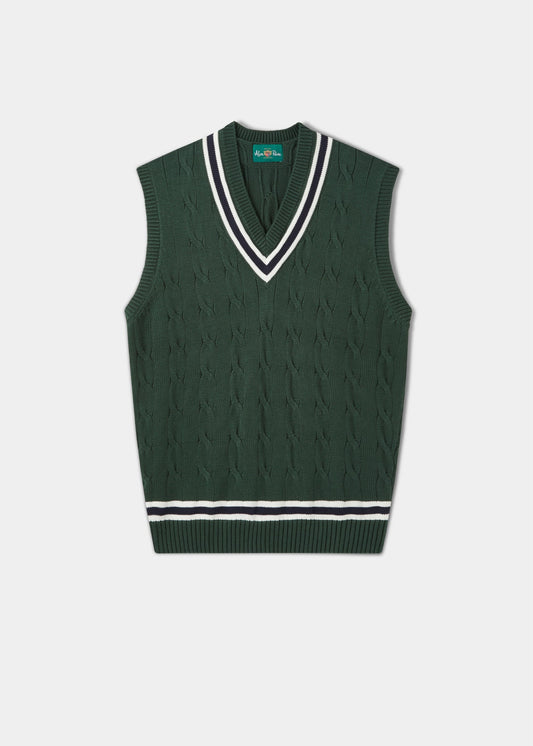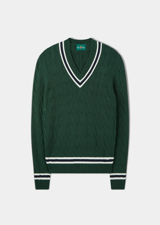 Our machine washable men's cricket jumpers (and slipovers) are knitted in pure cotton with a classic vee neck, ribbed cuffs, ribbed hem and featuring a traditional cable design.
